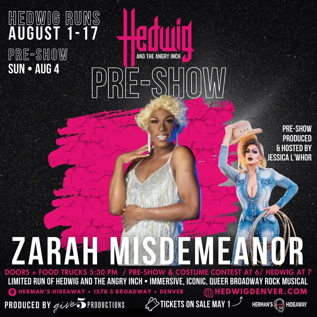 🤘 HEDWIG AND THE ANGRY INCH • Immersive, Iconic, Queer Broadway Rock Musical with variety pre-show by Jessica L’Whor 👑 @jessicalwhor . ‼️ VERY LIMITED RUN! August 1 - 17, 2024. Tickets go on sale May 1 and this show will sell out. Get email reminders, special 💲promo codes and learn more at www.hedwigdenver.com (Link in @give5productions IG Bio) . 🎵 Immerse yourself in the electrifying world of “Hedwig and the Angry Inch,” a groundbreaking Broadway rock musical with a gender bending twist. Experience the power of killer live music and queer storytelling like never before. . Doors open 30 minutes before pre-show. 🚚 Food trucks will be parked outside Herman’s Hideaway (1578 S Broadway, Denver) with delicious drinks 🍹 inside, (fabulous non-alcoholic options too! #soberfun ) So come early and come hungry and thirsty! . 🌟 Variety pre-show with drag, circus and burlesque acts one hour before Hedwig. Pre-show acts will be announced throughout the month of April. . 🤩 THURS, AUGUST 1: @remyd_official @thepettypatty with host Jessica L’Whor 🤩 FRIDAY, AUGUST 2: @inked.by.haley @glitter_grub with host Jessica L’Whor 🤩 SATURDAY, AUGUST 3: @enzobenzoofficial @brittanyblazeshearz with host Jessica L’Whor 🤩 SUNDAY, AUGUST 4: @anna_staysha_ @heymisszarah with host Jessica L’Whor . 👩🎤 Each night will have a costume contest with fabulous prizes and winners 🏆 Think 80s rock glam with East Berlin vibes 👨🎤 (Costumes are not required for entry.) . 🎟️ Tickets, cast info and more: www.hedwigdenver.com (Link in @give5productions IG Bio) . DON’T MISS THE THEATRICAL EVENT OF THE 2024 SUMMER IN DENVER! @hermanshideaway . @broadway_licensing . . #hedwigdenver #queer #HedwigandtheAngryInch #BroadwayMusical #RockMusical #LGBTQTheater #QueerArtistry #GenderIdentity #LoveIsLove #DenverTheater #livemusic #CultClassic #TonyAwardWinner #MusicalTheater #IdentityExploration #oneofthem #ArtisticExpression #denverqueer #gaydenver #denver #colorado #denverdrag #dragqueen #limitedrun