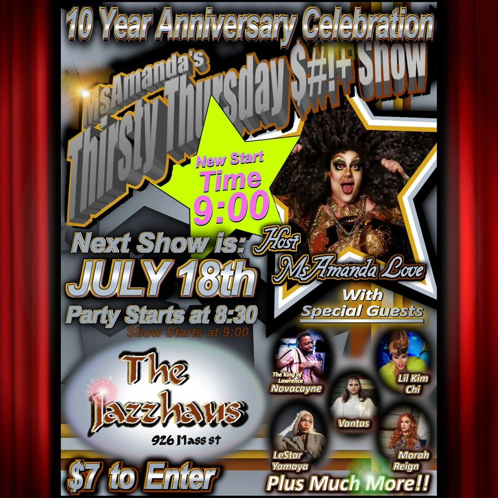Celebrate a decade of success with us on July 18th at the "10 Year Anniversary Celebration"! Join us for a night filled with joy and nostalgia as we mark this incredible milestone rarely seen in our community. Special guests including performers like Morah Reign, Kim Chi, and Vontas LeStar will grace the event, promising an unforgettable evening. The party kicks off at 8:30 PM at 926 Mass St, with a $7 entry fee ensuring you don't miss out on this historic occasion. Don't forget to save the date and be a part of this exceptional celebration!